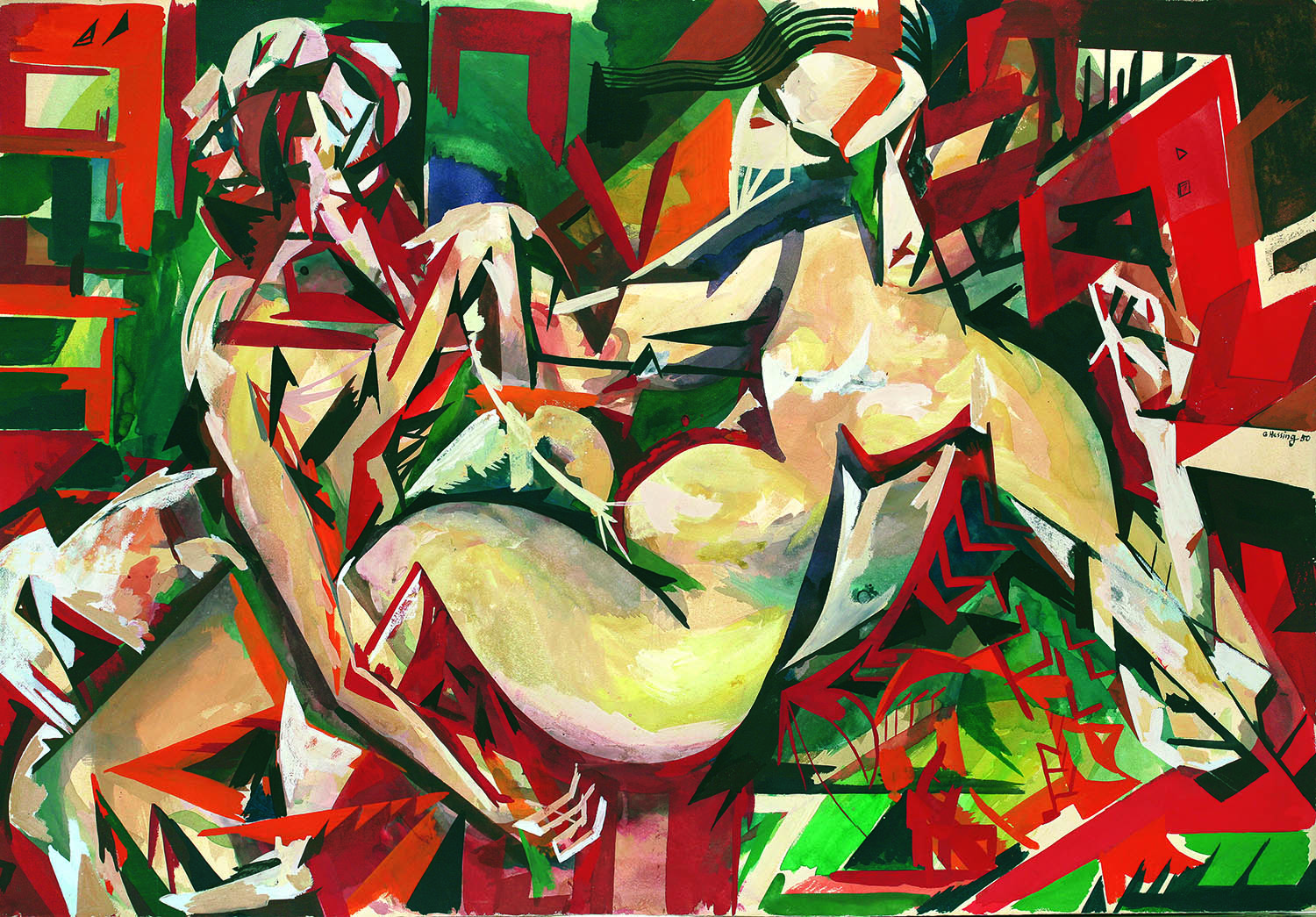 Der 1909 in Czernowitz geborene Gustav Hessing übersiedelt in den Dreißigerjahren nach Wien, um an der Akademie bei Ferdinand Andri und Carl Fahringer zu studieren. Zu der Zeit ist er stark vom österreichischen Expressionismus beeinflusst und bedient sich einer intensiven Farbpalette, besonders die Werke Edvard Munchs und Richard Gerstls hinterlassen einen prägenden Eindruck. Später beschäftigt er sich eindringlich mit den Bildern Paul Cézannes und den nachfolgenden Kubisten, aber auch mit dem Surrealismus sowie, in seinem Spätwerk, mit den Tachisten. Nachhaltigen Einfluss übt die Malerei Paul Cézannes, den Hessing zutiefst bewundert, auf den Maler aus, wobei er nie kopiert, sondern bemüht ist, eine eigene Formensprache zu finden. Dies mündet in einer intensiven Auseinandersetzung mit dem Medium der Farbe. Hessing wählt kräftige Töne, die er in unregelmäßigen, großen Feldern wie ein Mosaik nebeneinander setzt wobei seine Bilder weitgehend gegenständlich bleiben. Der handwerkliche Aspekt spielt dabei eine wichtige Rolle, Maltechnik und Grundierung zeugen von großer Sorgfalt, zum Teil fertigt der Künstler sogar seine Farben selbst an. Dementsprechend lässt sich Hessing auch Zeit mit seiner Arbeit: häufig stellt er Bilder weg, um später wieder daran weiterzuarbeiten – ein Prozess, der sich auch über mehrere Jahre ziehen kann. Jeder Farbfleck wird wie ein Baustein bewusst an seinen Platz gesetzt, wobei die einzelnen Bildpartien auf diese Weise oft erst nach längeren Zeitabschnitten zusammenwachsen und Form annehmen. Der Raum spielt dabei praktisch keine Rolle. Das Wesentliche ergibt sich bei Hessing durch das Zusammenspiel und die Anordnung der Farben, durch die er seine Menschen und Stillleben quasi dem Raum entrückt und sie gleichzeitig als Teil eines größeren Systems darstellt.